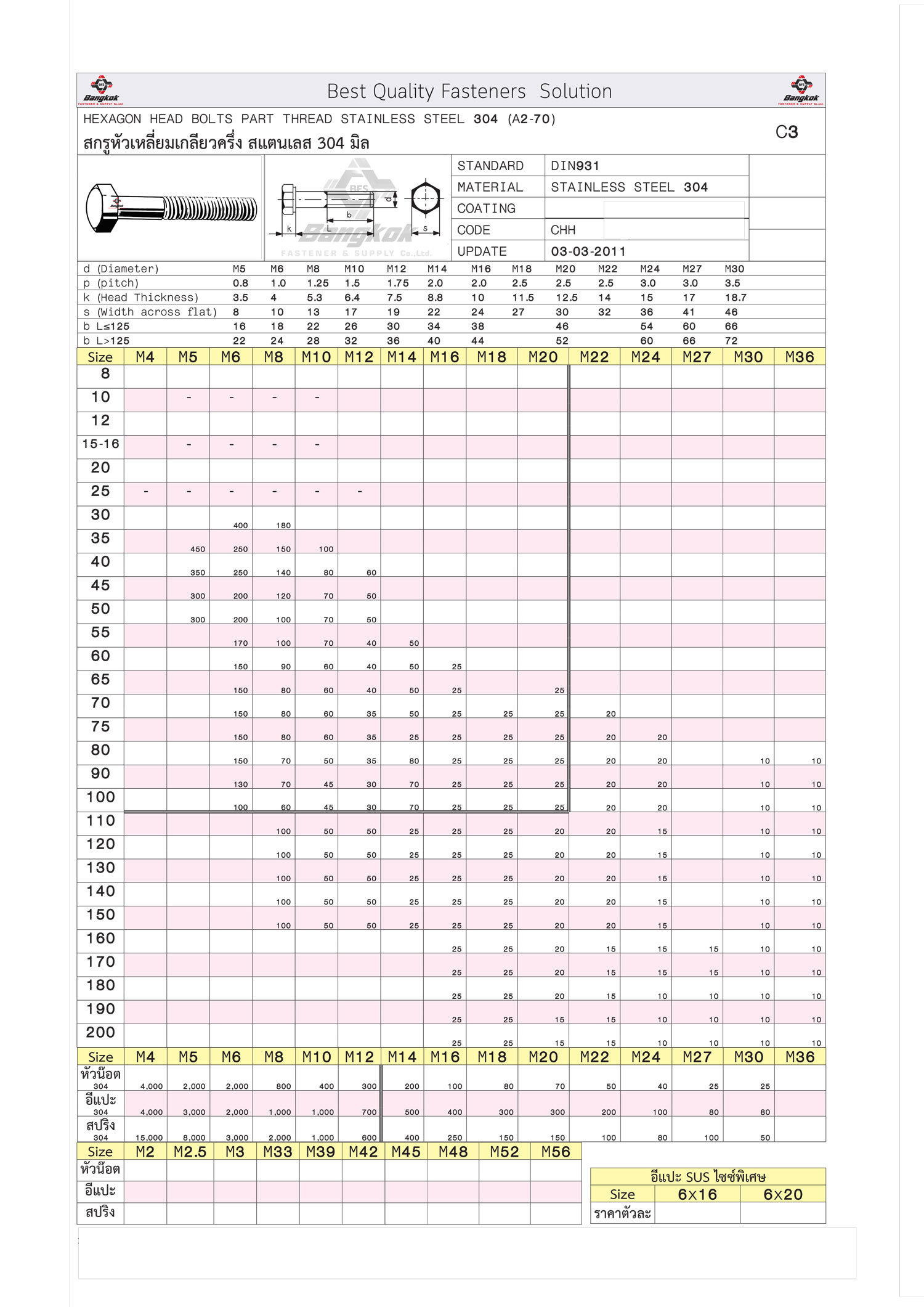 สกรูหัวเหลี่ยมเกลียวครึ่ง304 มิล