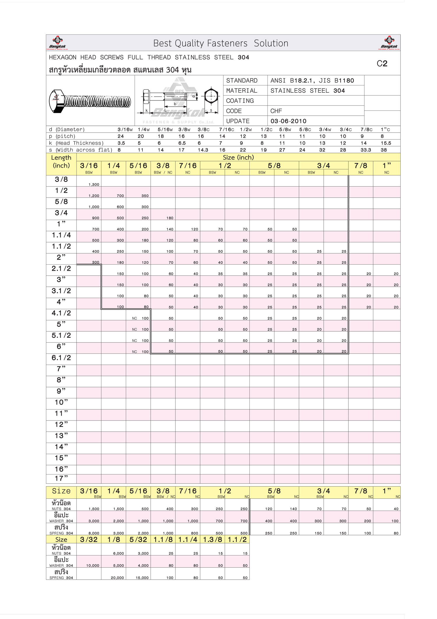 สกรูหัวเหลี่ยมเกลียวตลอด304 หุน